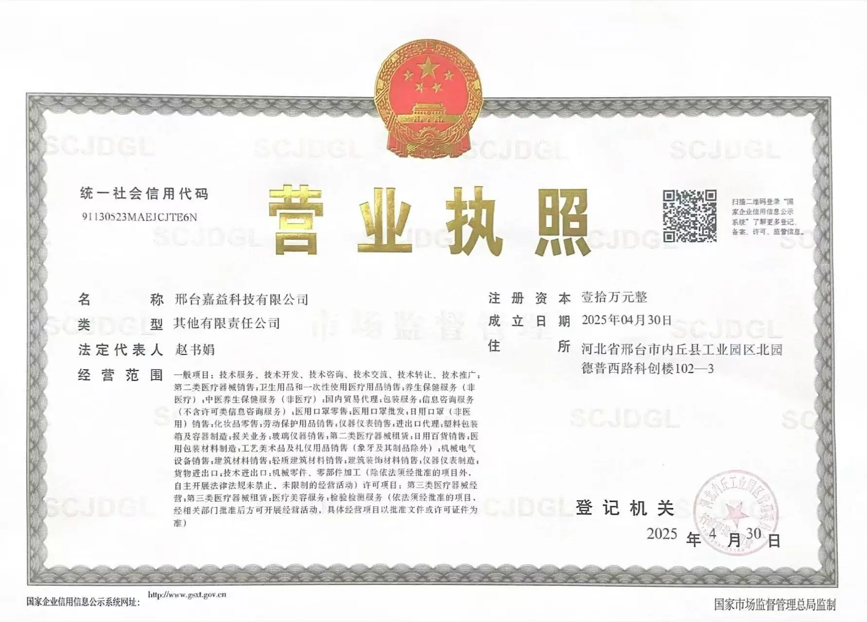 Registered address : Room 102-3 Science And Technology Innovation Building, Depu West Road, North Park, Neiqiu County Industrial Park Xingtai Hebei China